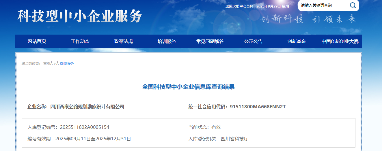 四川西康公路规划勘察设计有限公司再获“科技型中小企业”认定