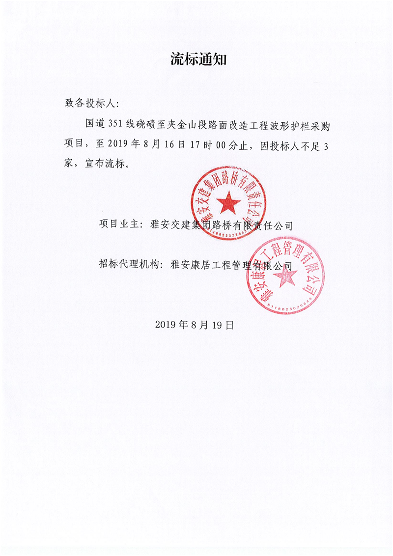 K8凯发建设集团路桥有限责任公司国道351线硗碛至夹金山段路面改造工程波形护栏采购项目流标通知