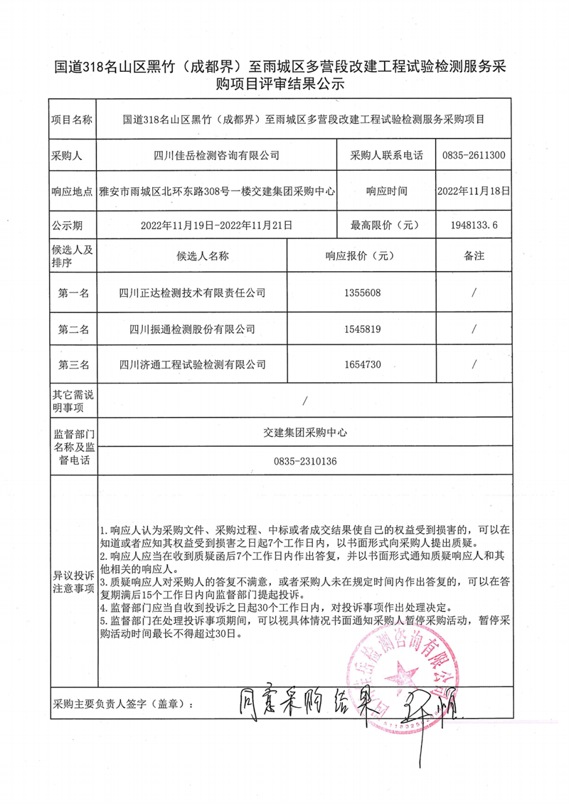 四川佳岳检测咨询有限公司国道318名山区黑竹(成都界)至雨城区多营段改建工程试验检测服务采购项目评审结果公示