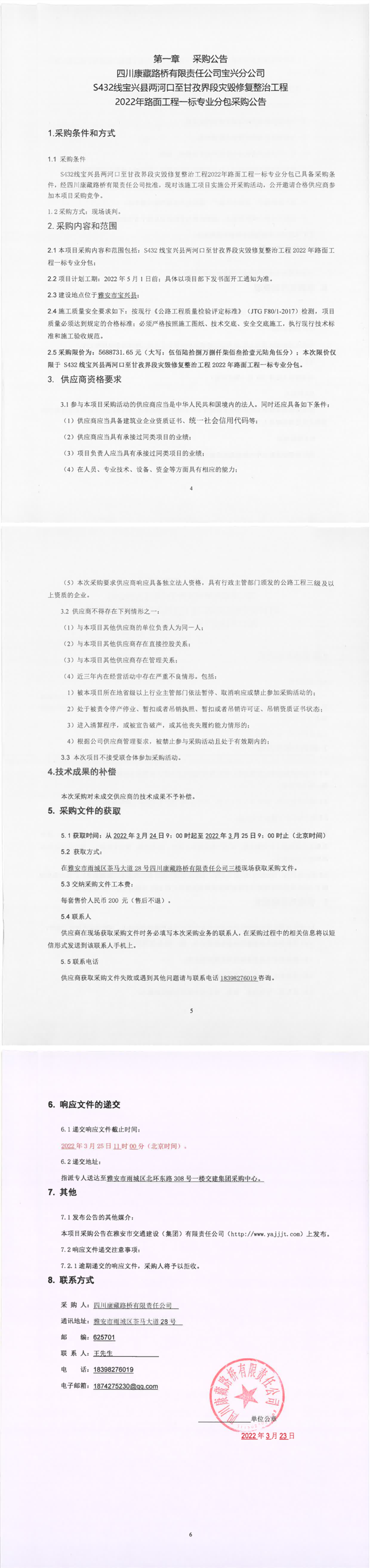 四川康藏路桥有限责任公司S432线宝兴县两河口至甘孜界段灾毁修复整治工程2022年路面工程一标专业分包采购公告