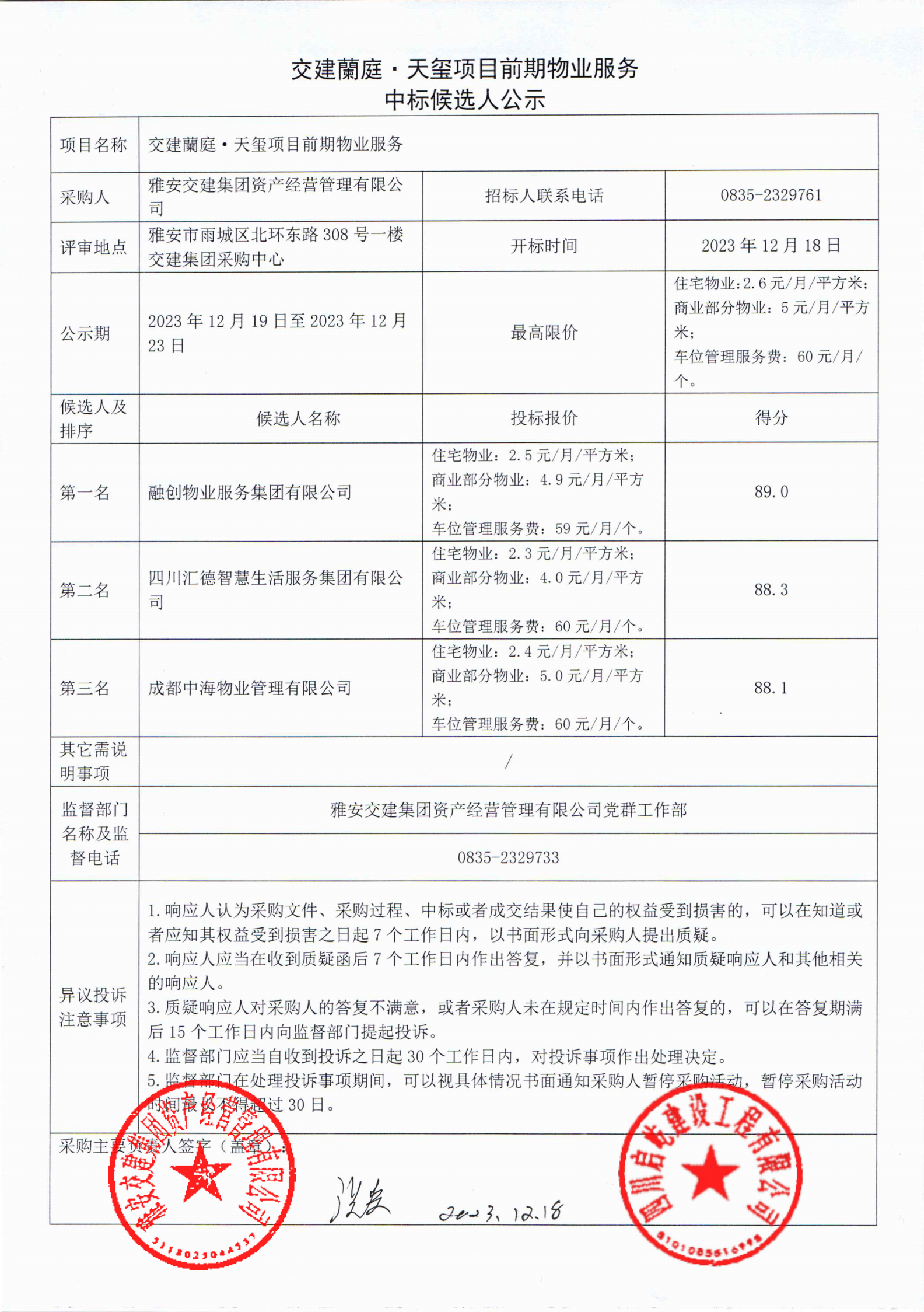 K8凯发建设集团资产经营管理有限公司交建蘭庭·天玺项现在期物业服务中标候选人公示