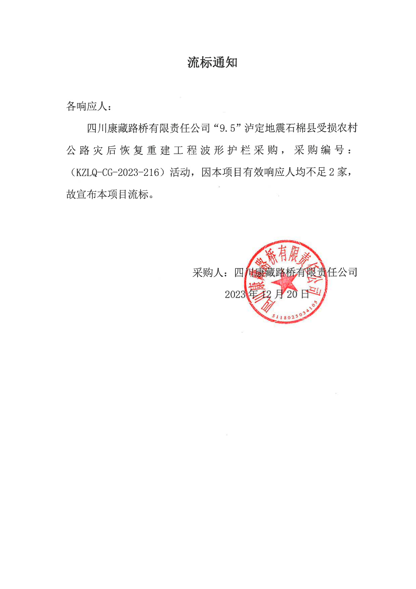四川康藏路桥有限责任公司“9.5”泸定地震石棉县受损农村公路灾后恢复重建工程波形护栏采购流标通知