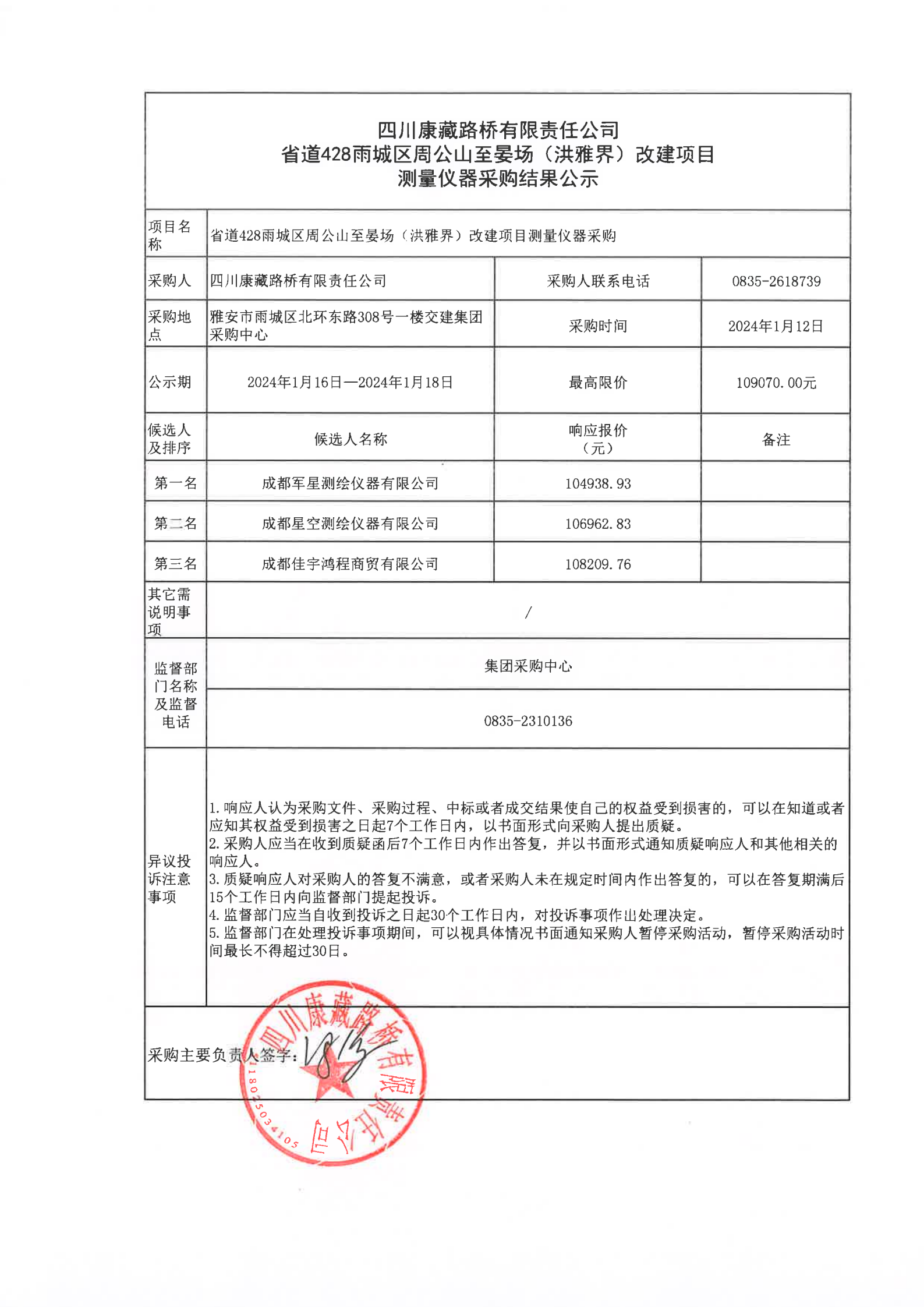 四川康藏路桥有限责任公省道428雨城区周公山至晏场(洪雅界)改建项目测量仪器采购结果公示