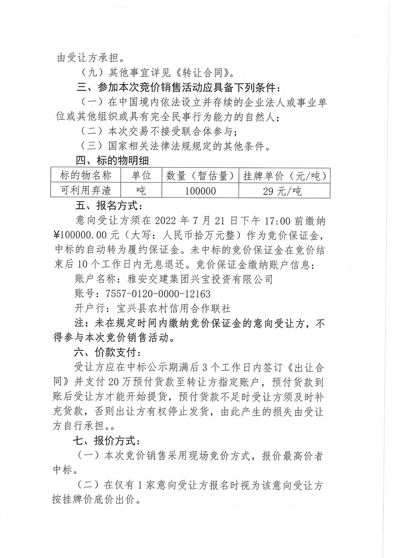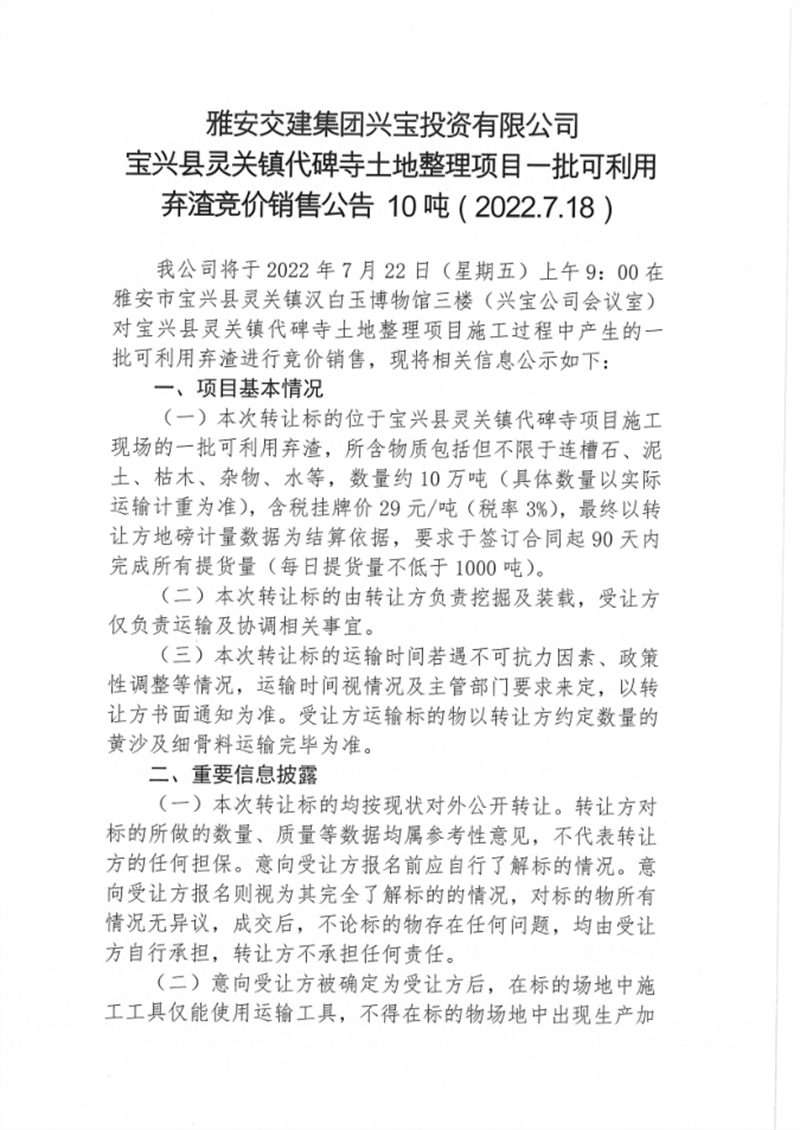 宝兴县灵关镇代碑寺土地整理项目一批可利用弃渣竞价销售公告7.18(10万吨)