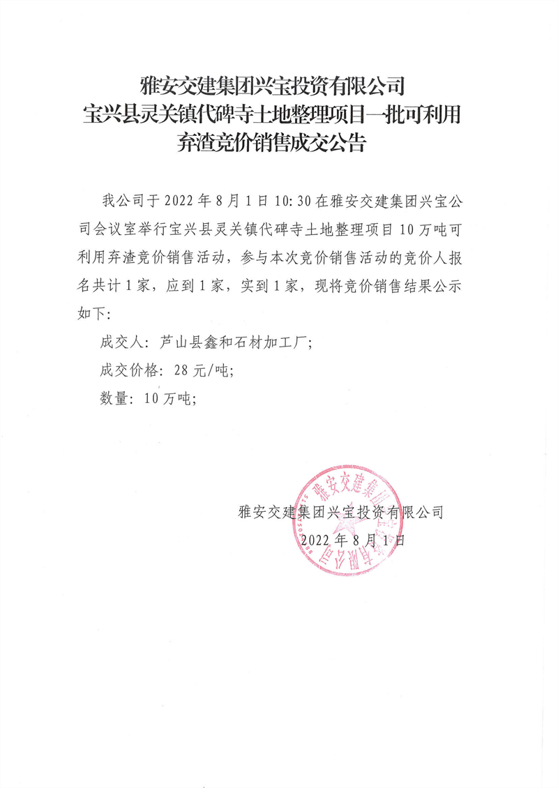 K8凯发建设集团兴宝投资有限公司灵关镇代碑寺土地整理项目10万吨可利用弃渣竞价销售成交公告(2022.8.1)