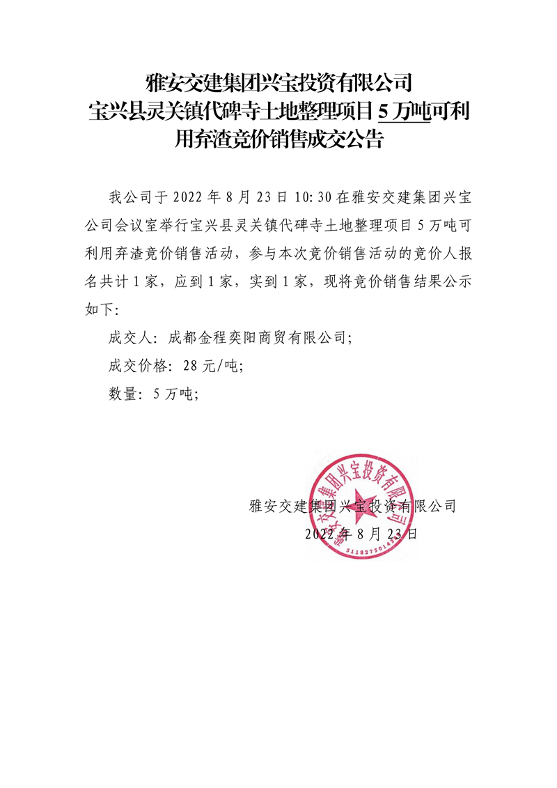 K8凯发建设集团兴宝投资有限公司宝兴县灵关镇代碑寺土地整理项目5万吨可利用弃渣竞价销售成交公告(8.23)