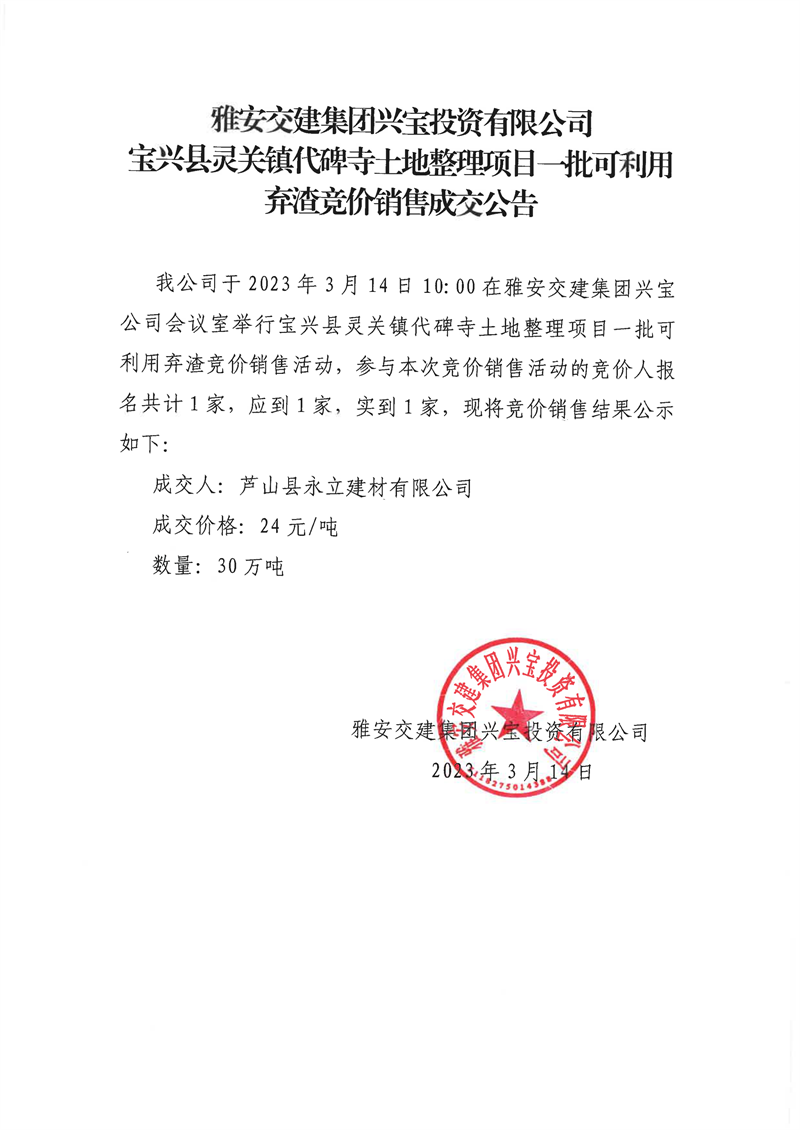 K8凯发建设集团兴宝投资有限公司灵关镇代碑寺土地整理项目30万吨可利用弃渣竞价销售成交公告(2023.3.20)