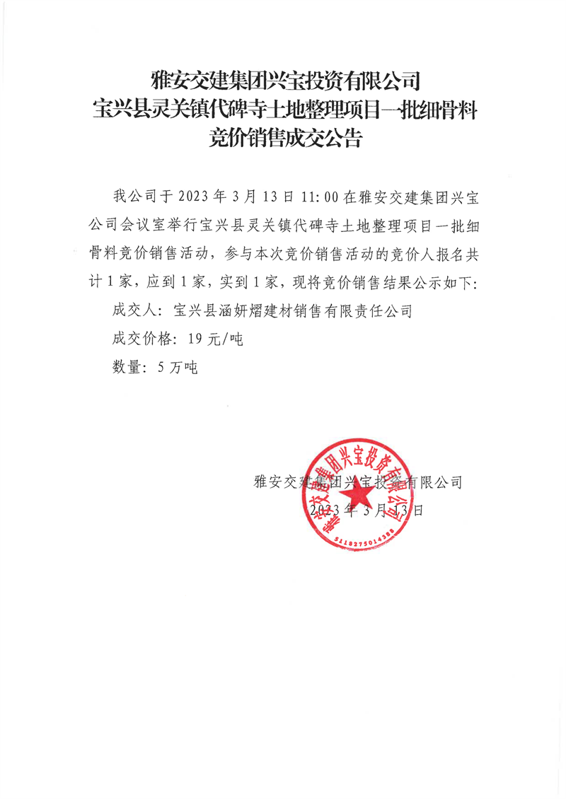 K8凯发建设集团兴宝投资有限公司30万吨可利用弃渣竞价销售成交公告、5万吨细骨料竟价成效公告(2023.3.14)